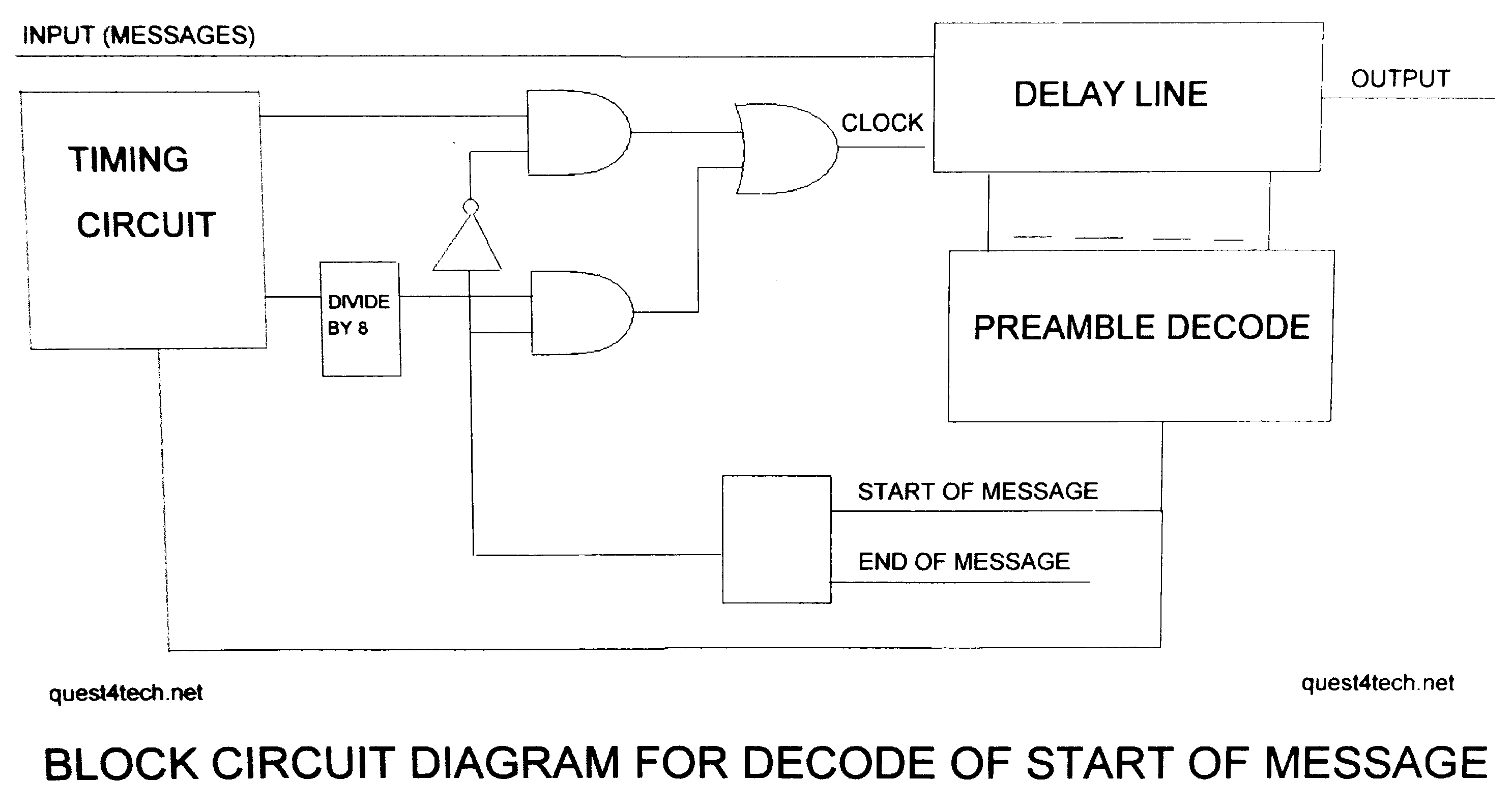 The input is a series of digital pulses that represent words of a serial message. The message should have a distinctive preample word to identify as as a message, the type of message and the start of message.